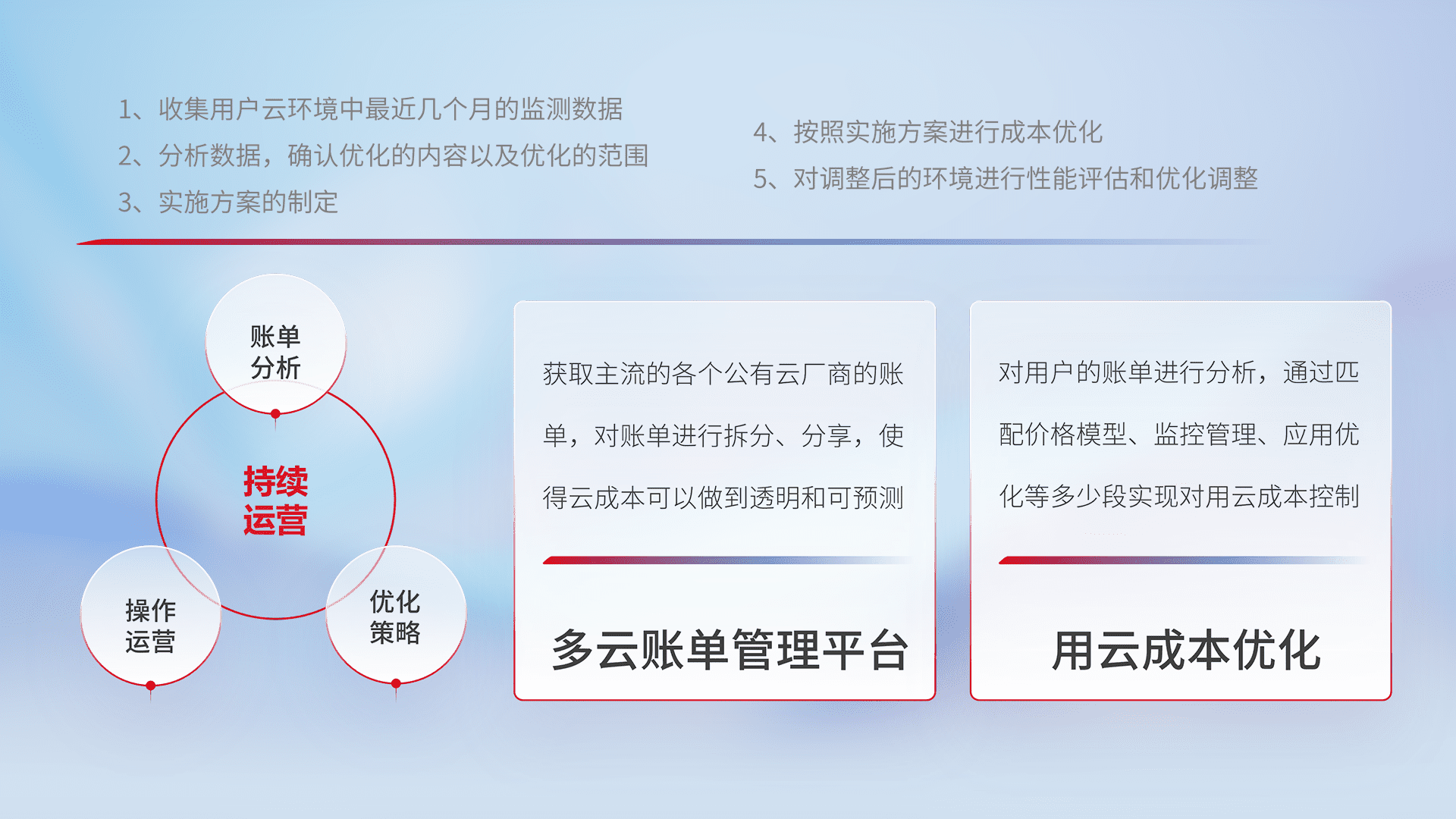 通过多云纳管,,以统一的资源数据模型把客户的云资源进行抽象和封装,,,,进而实现对多云资源的统一操作,,,,保障云资源管理的可靠性、、稳定性与可用性。。量身定制化运维内容,,配置、、开发运维、、补丁管理、、、、备份、、、、监控、、认证和访问管理、、、审计和日常巡检等,,保障在用云过程中的可靠度,,,,稳定度以及高可用率。。
